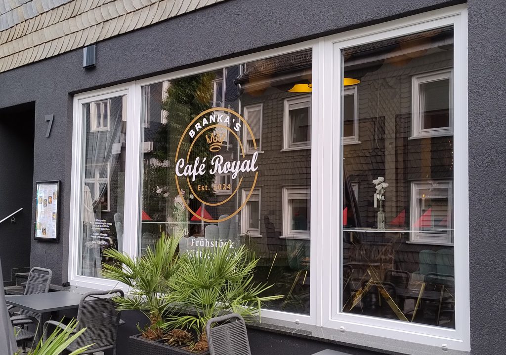 Also ist die Entscheidung auf Klebefolie in weiß und gold gefallen. Insgesamt 100 cm Durchmesser, darunter mit „Frückstück – Mittagstisch – Abenessen“ noch das Angebot des Cafes aufgelistet. Auf dem linken Fenster noch die Öffnungszeiten und die Ruhetage, fertig ist die neue Werbung vom Cafe Royal in Wipperfürth, der ältesten Stadt im Bergischen Land!