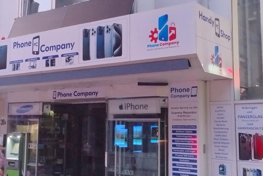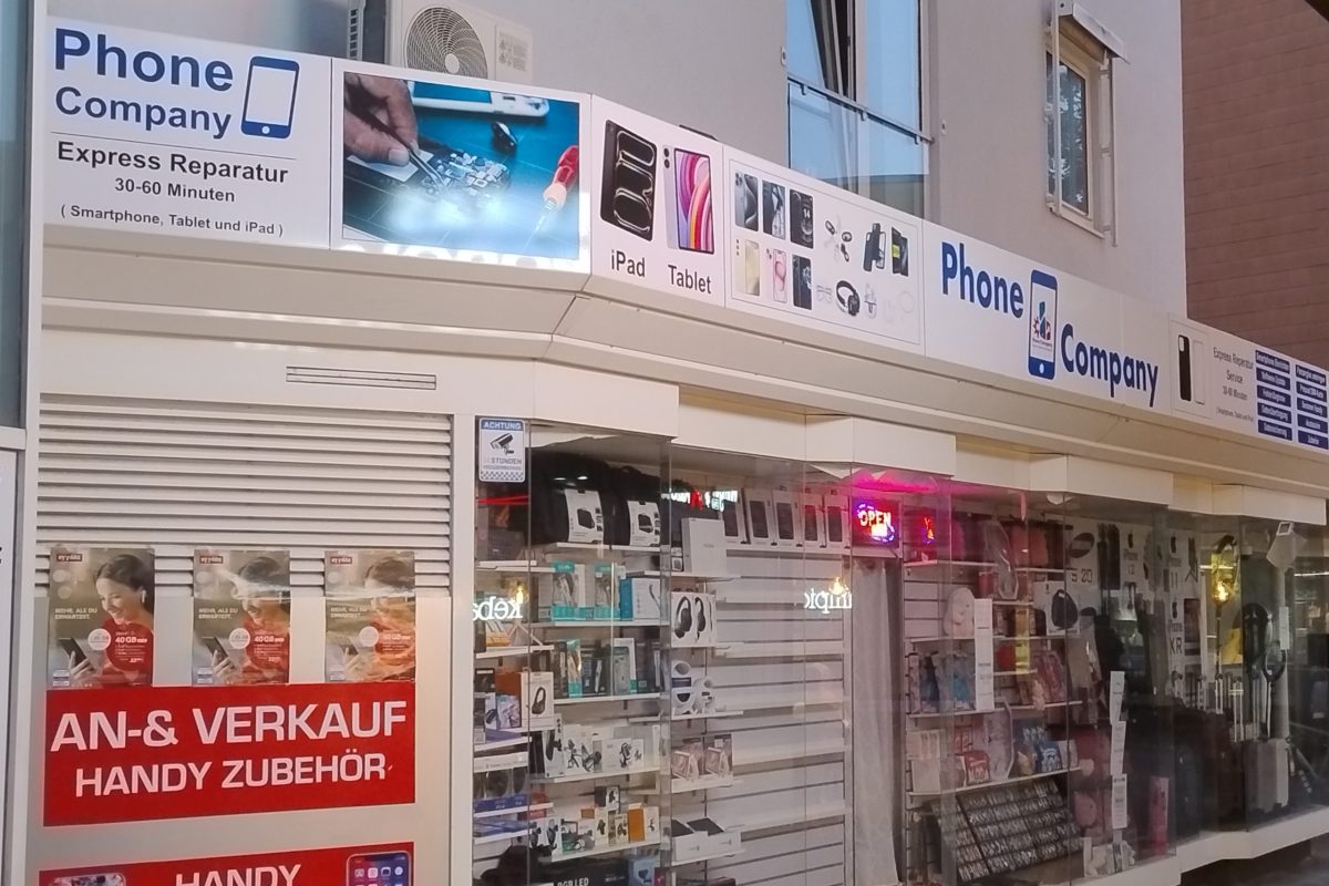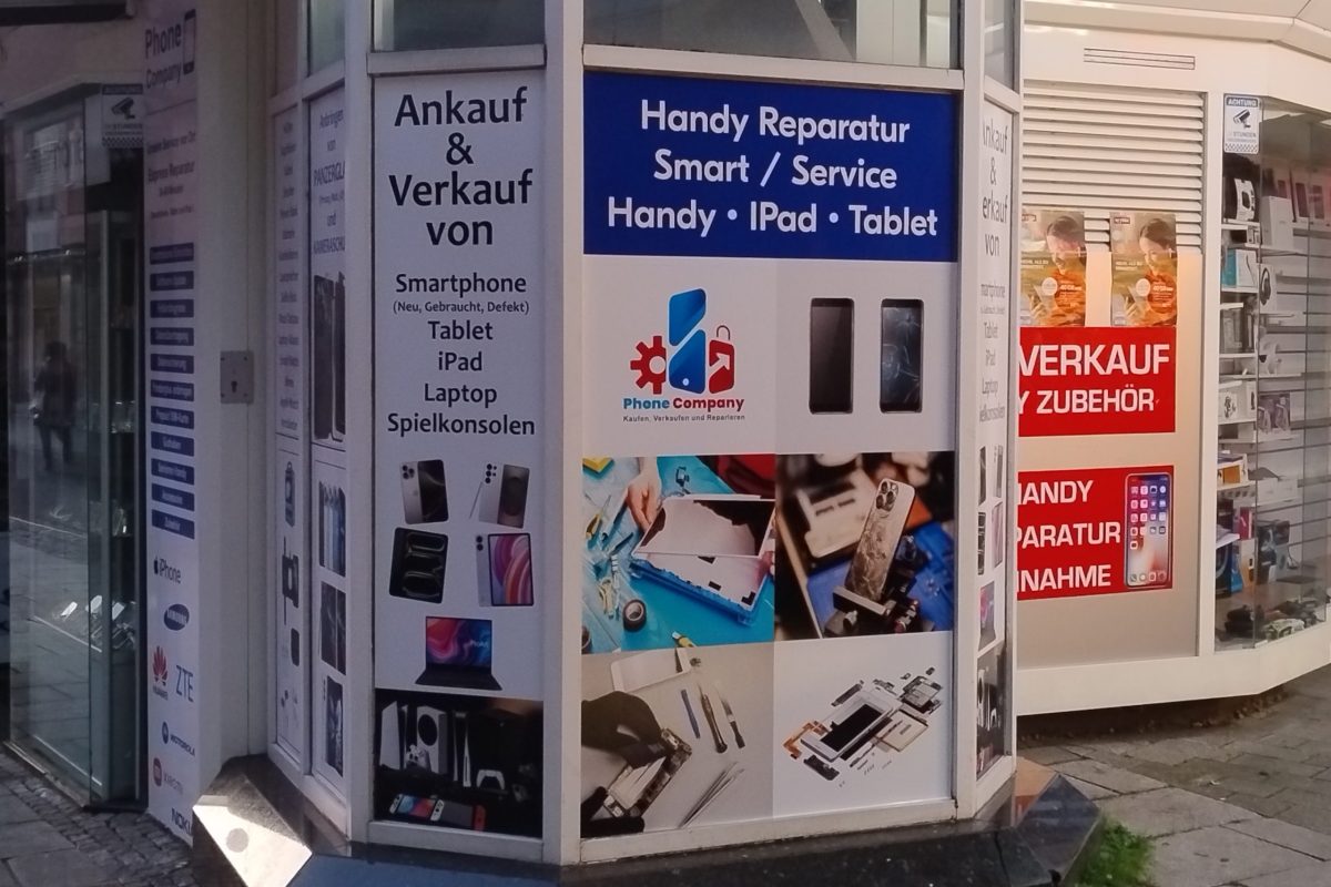 Direkt neben Royal Tattoo Grevenbroich, wo wir ja schon mehrere Werbemaßnahmen durchgeführt haben, befindet sich dieses Geschäft für Handy- und Elektronik-Zubehör. Heute wurde die komplette Leiste oberhalb der Fenster neu beklebt, ebenso der gläserne achteckige Anbau, welcher den Aufzugsschacht beherbergt. Außerdem wurden einzelne Scheiben des Ladenlokals mit neuen Klebefolien versehen.