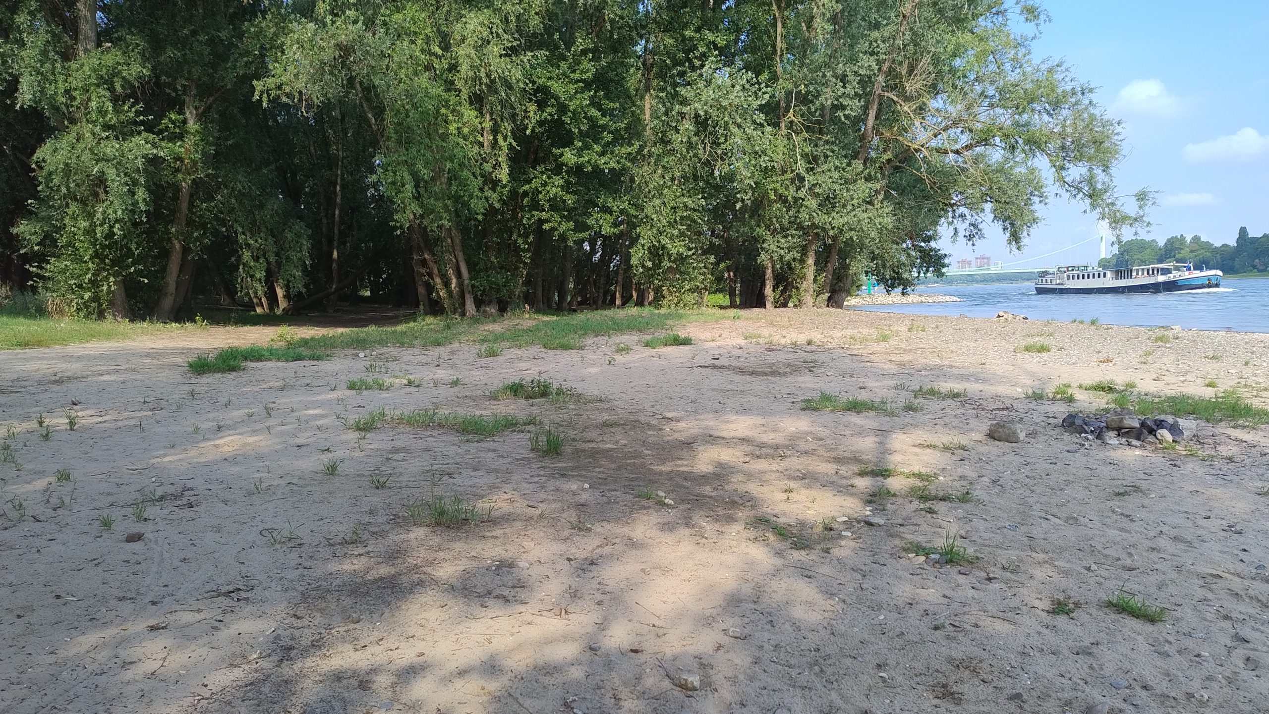 Zugegeben, an warmen Tage ist hier viel los, aber weiter nach Süden gibt es viele versteckte Ecken, die entweder Bäume, den Strand oden den Rhein im Hintergrund haben. Zu beachten ist ab September 2025 natürlich das Badeverbot im Rhein!