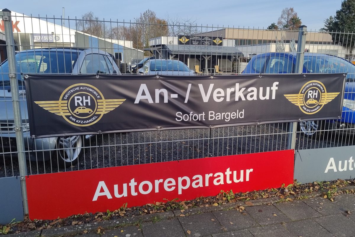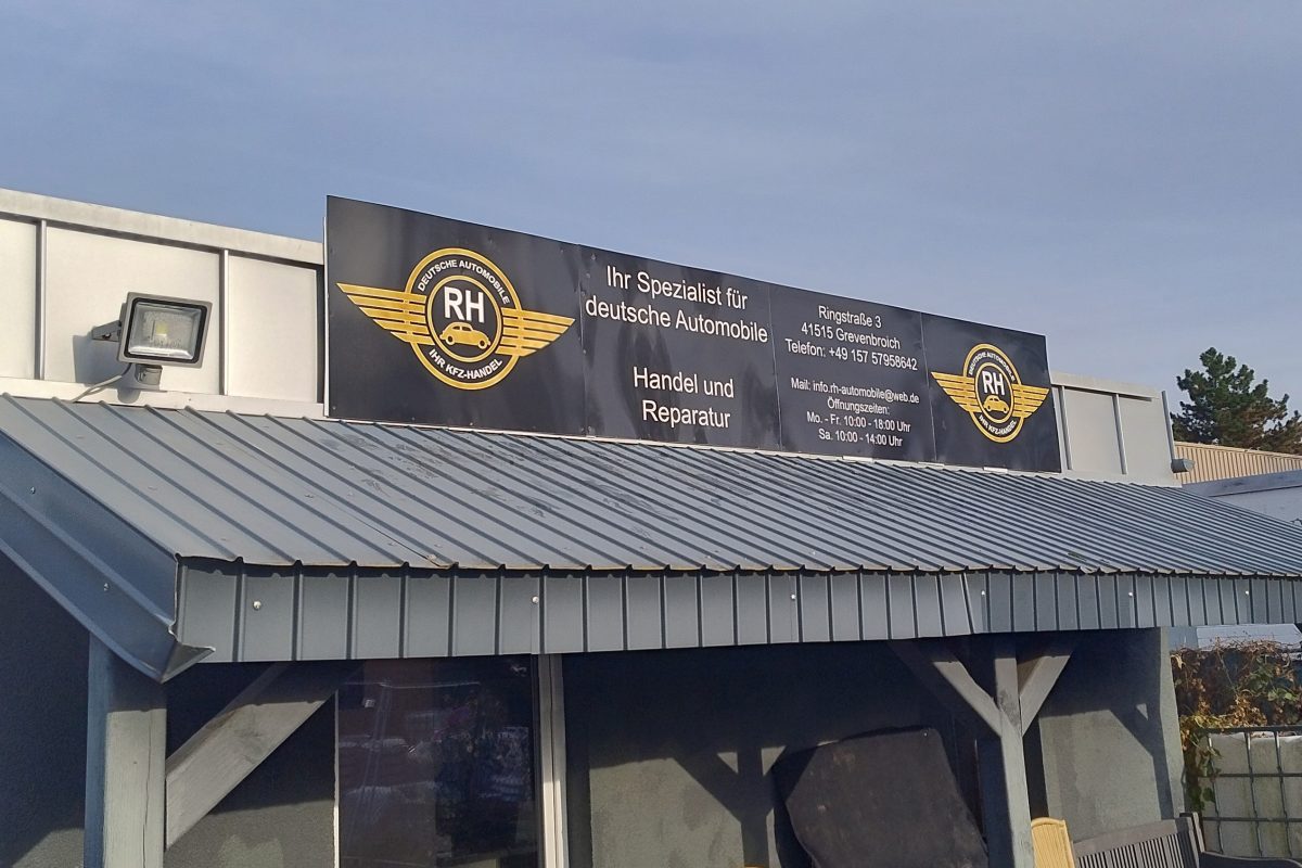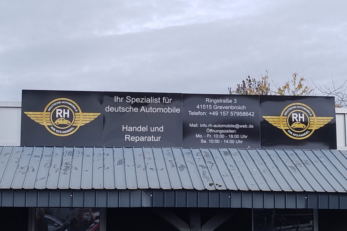 Ein kleiner Autohandel in Grevenbroich eröffnet neu im nördlichen Stadtteil Noithausen. Dafür müssen viele grundlegende Werbemaßnahmen erstellt und beschafft werden. Neben Visitenkarten wurden diverse Schilder und Klebefolien designt und gedruckt. Neben diversen bedruckten Aluminium-Verbundplatten für den Zaun gab es einen Werbebanner aus dicker PVC-Plane (LKW-Plane) sowie Schilder aus Hartschaumplatten, die auf dem Dach des Büros montiert wurden.
