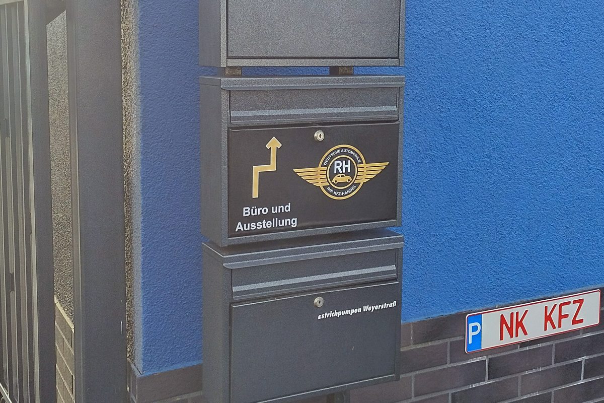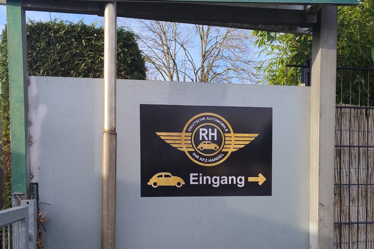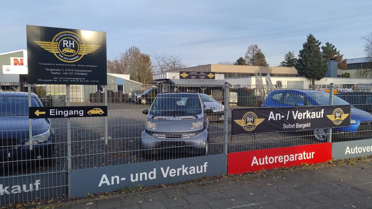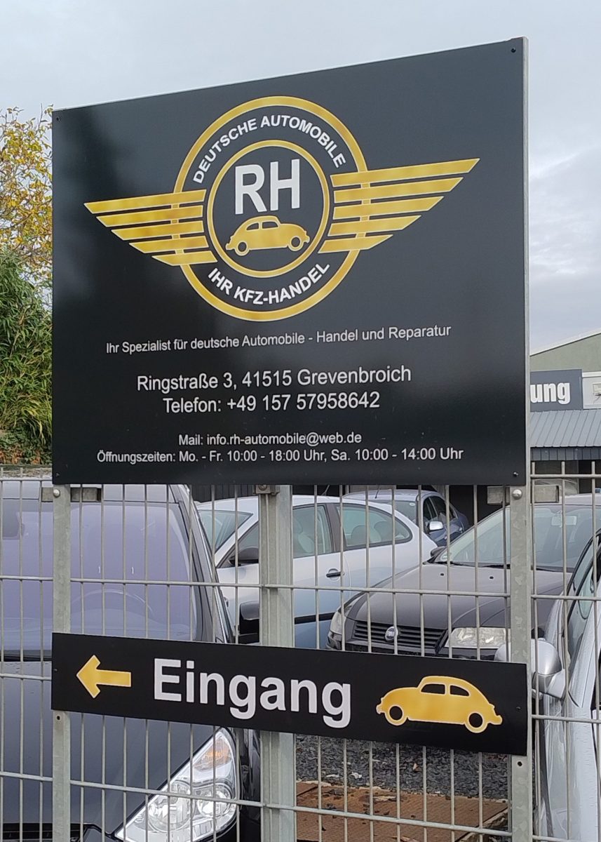 Ein kleiner Autohandel in Grevenbroich eröffnet neu im nördlichen Stadtteil Noithausen. Dafür müssen viele grundlegende Werbemaßnahmen erstellt und beschafft werden. Neben Visitenkarten wurden diverse Schilder und Klebefolien designt und gedruckt. Neben diversen bedruckten Aluminium-Verbundplatten für den Zaun gab es einen Werbebanner aus dicker PVC-Plane (LKW-Plane) sowie Schilder aus Hartschaumplatten, die auf dem Dach des Büros montiert wurden.
